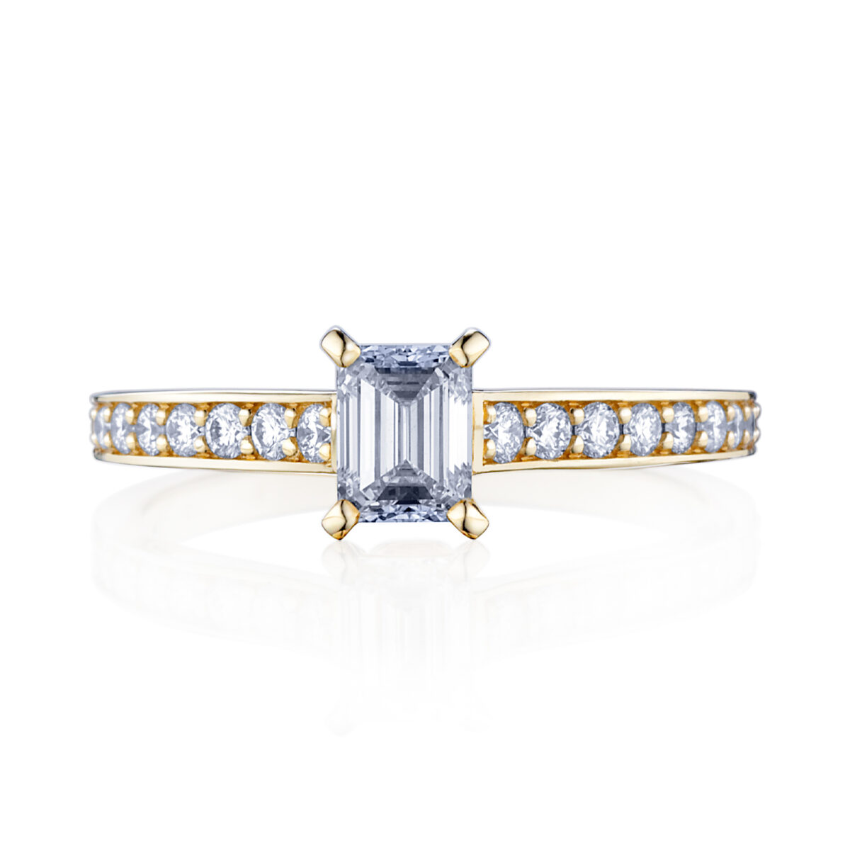 Hlavný diamant s exkluzívnym brusom emerald osvetľuje prsteň svojím čistým a rafinovaným vzhľadom, ktorý odráža svetlo v každom uhle. Tento typ rezu je známy svojou sofistikovanou krásou a optickou čistotou, čím vytvára fascinujúci efekt.