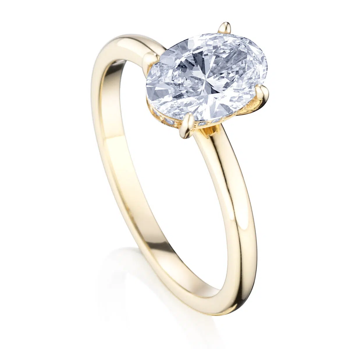Zásnubný prsteň Zorya vyrábame na mieru zo 14 karátového zlata, 18 karátového zlata alebo platiny. Dominantou zásnubného prsteňa je centrálny 1 ct drahokam v tvare brusu oval osadený v štýle hidden halo.